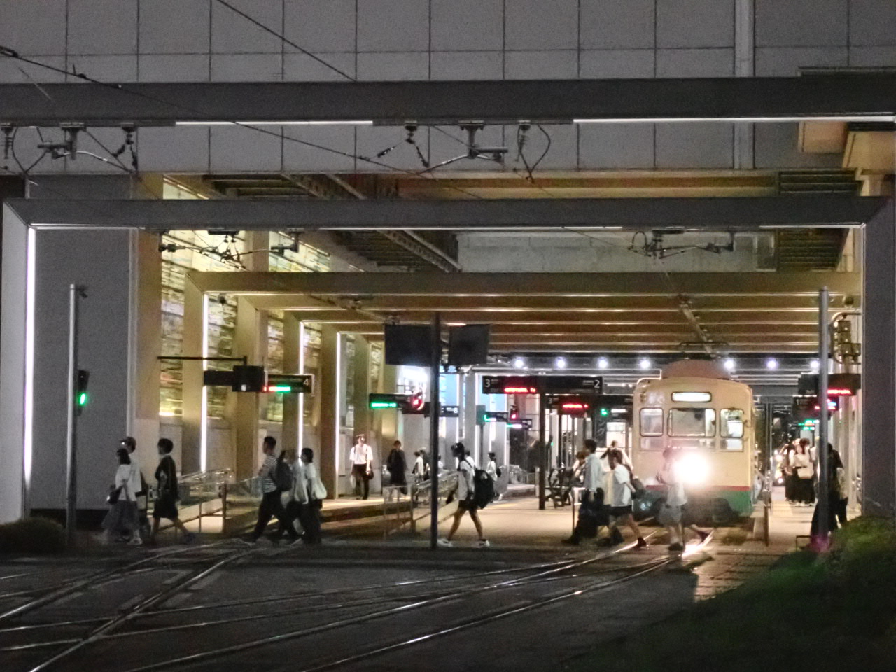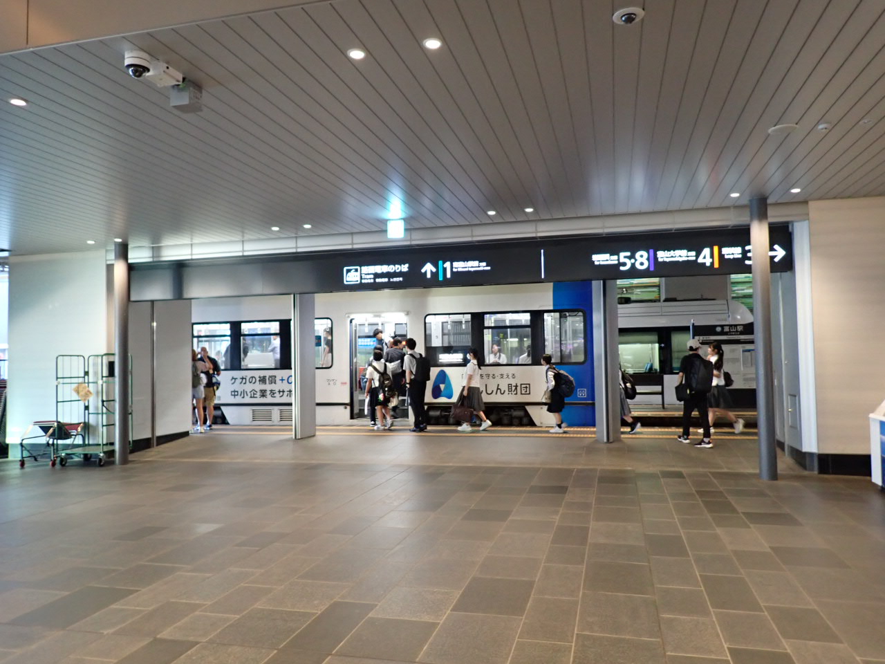 路面電車は富山駅を南北方向に貫通して走っていて、JRの改札を出た正面に路面電車の駅があり、