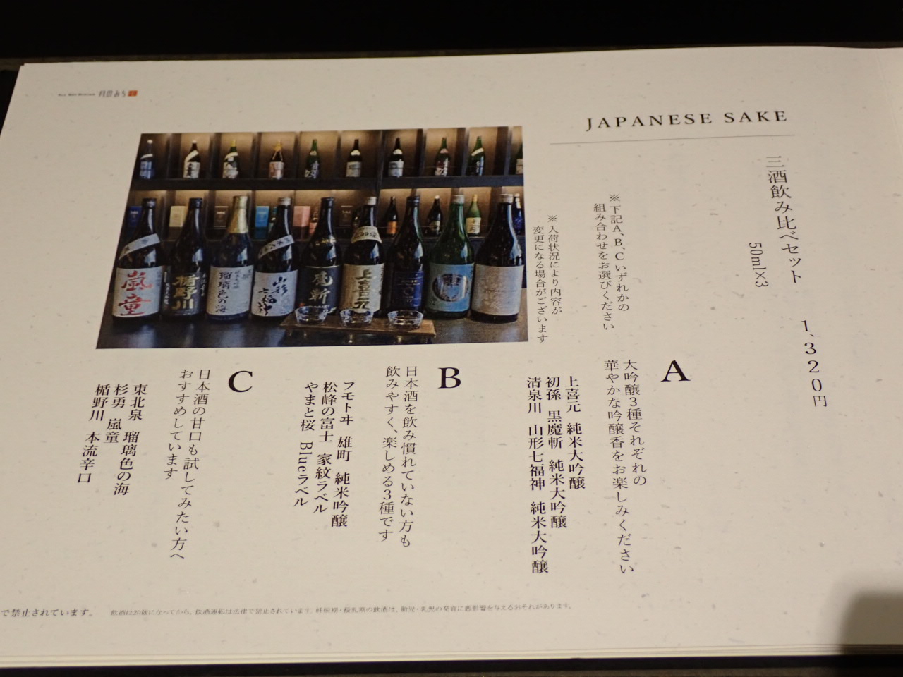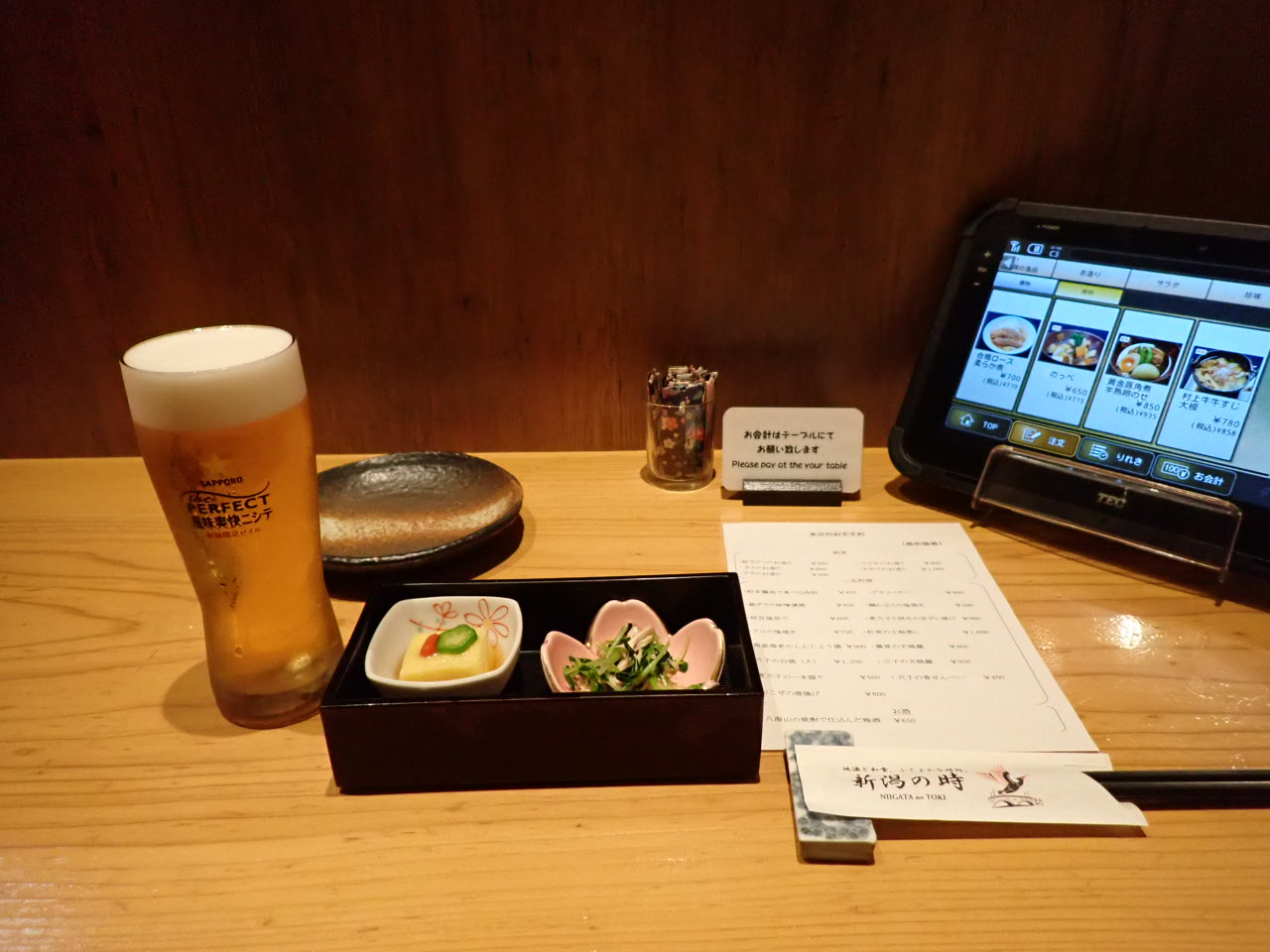 越後湯沢の地酒「白瀧(しらたき)」を注文。新潟の米と魚沼の水で作ったうまい酒です。