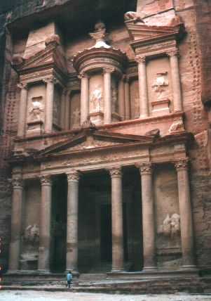 エル・ハズネは一枚岩をくり抜いて造られた巨大な宝物殿。紀元前6世紀頃のナバテア人の遺跡。内部にはさらにいくつもの部屋がある。ペトラは広大な遺跡群で、他の遺跡もすべて岩をくり抜いて造ってある。